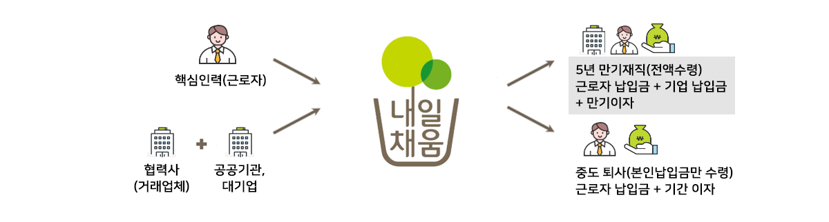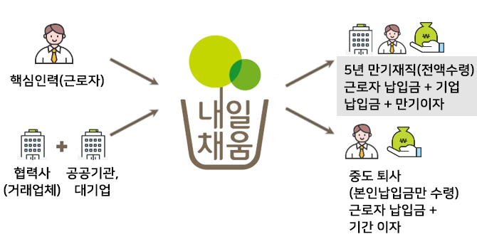 공·대기업과 협업을 맺고 내일채움공제를 활용하여 협력사(거래업체) 핵심인력의 장기재직 촉진 및 인력양성 지원
